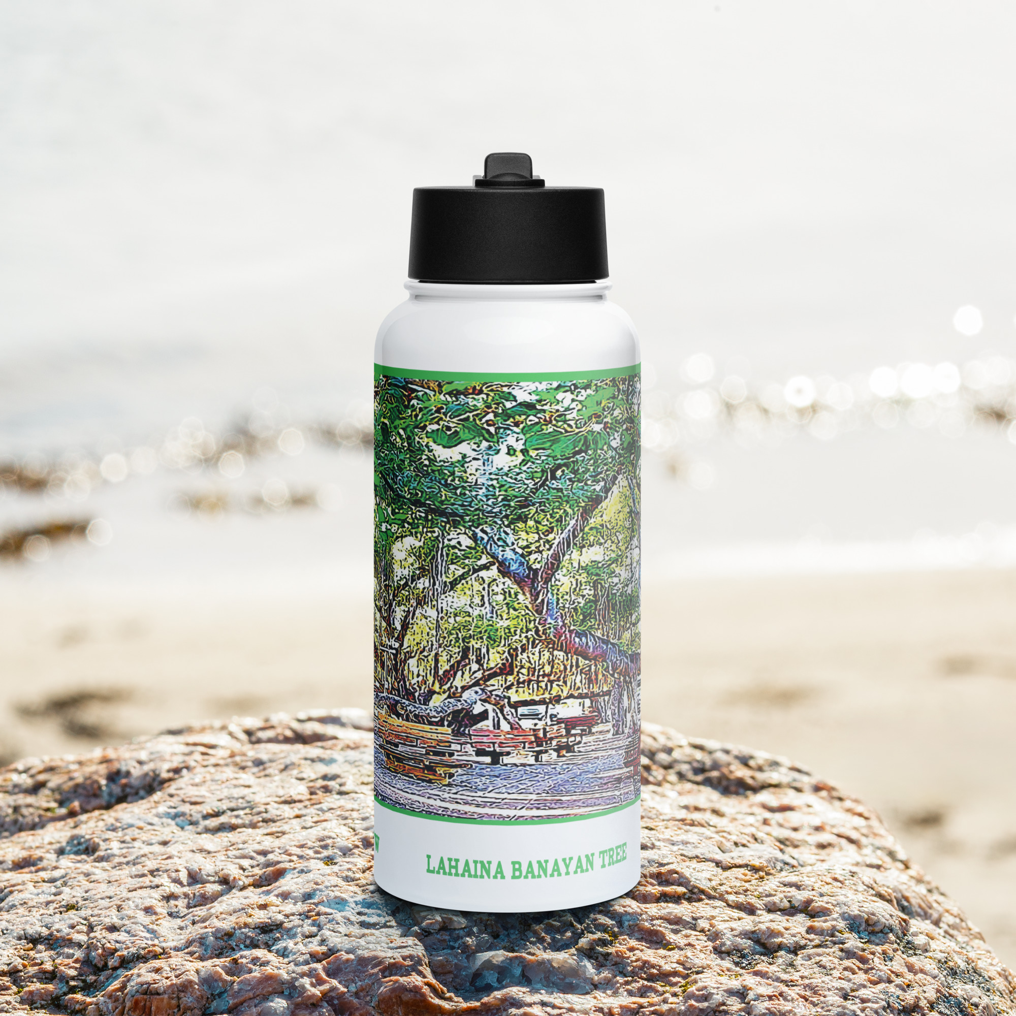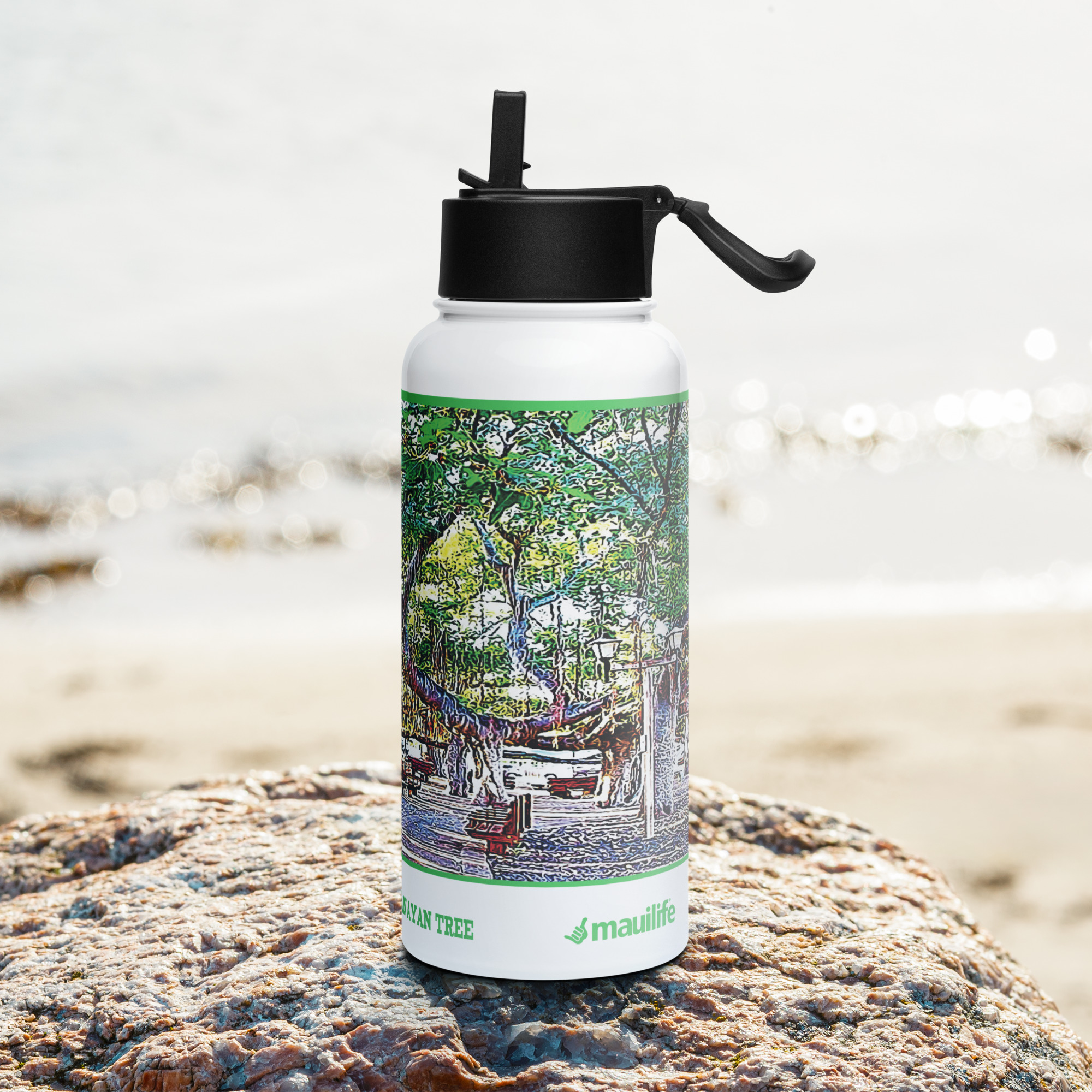 This 32 oz water bottle features art from the historic Lahaina Banyan Tree. Features as wide-mouth foldable straw and a rotating handle for easy carrying.
